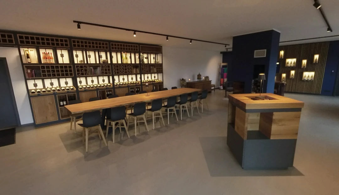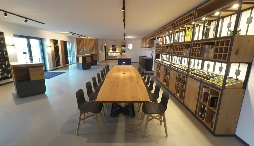 Bereits der Eingang zur Vinothek lässt vermuten, dass neue Zeiten für unsere Ständerbauhalle, in die das Weingut in den 60er Jahren umgezogen war, angebrochen sind. Das Interieur besticht durch ausgesuchte Antiquitäten und individuell angefertigte Eichenholz-Elemente aus dem nahegelegenen Hunsrück. Der großzügig einsehbare Kamin ist ideal platziert als Raumteiler zwischen Kaminlounge, Weinbibliothek und Verkostungsraum. Das moderne Farbkonzept orientiert sich an den klassisch-plakativen Weinetiketten, die das Familienwappen unseres westfälischen Uradelsgeschlechts aufgreifen.